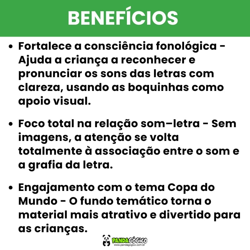 ✅ Visual temático e atrativo: O fundo com o tema da Copa do Mundo desperta o interesse e engajamento dos alunos, criando uma conexão com o universo lúdico e esportivo.
