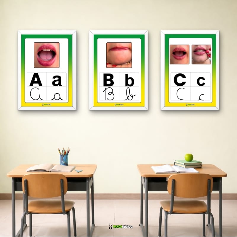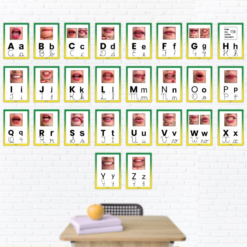 ✅ Favorece a consciência fonológica: Ajuda as crianças a perceberem e reproduzirem os sons da fala com mais clareza, por meio da associação direta entre letra e boquinha articulatória.
