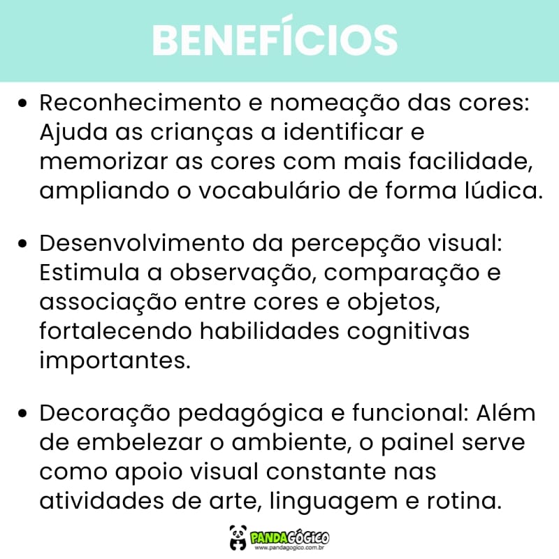 • Reconhecimento visual das cores – Ajuda a criança a identificar e nomear as cores com mais facilidade.